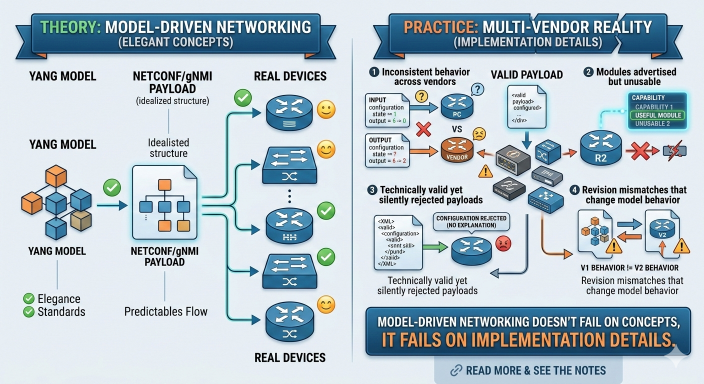 The process of building this tutorial made something else clear: the same inconsistencies that make model-driven configuration hard to learn are what make it hard to automate at scale. Every organization that manages a multi-vendor network using YANG-based APIs has to deal with the namespace differences, the revision mismatches, and the gaps in OpenConfig coverage, and they may need to deal with them by writing vendor-specific code that is fragile and hard to maintain.